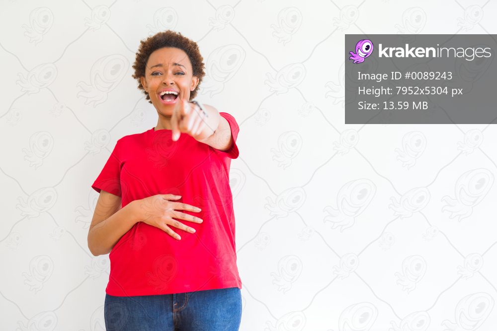 Young beautiful african american woman over white background Laughing of you, pointing to the camera with finger hand over chest, shame expression