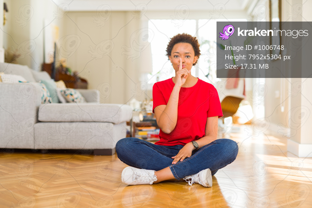 Young beautiful african american woman sitting on the floor at home asking to be quiet with finger on lips. Silence and secret concept.