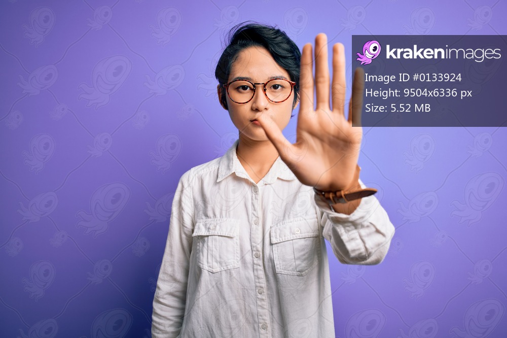 Young beautiful asian girl wearing casual shirt and glasses standing over purple background doing stop sing with palm of the hand. Warning expression with negative and serious gesture on the face. - Kraken Images