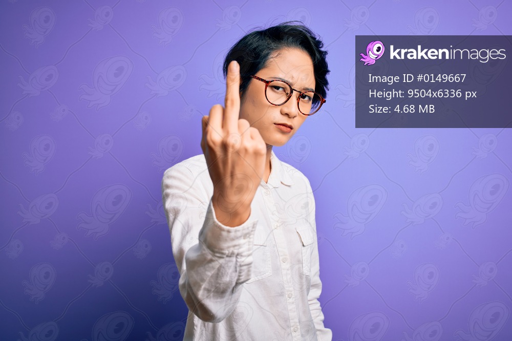Young beautiful asian girl wearing casual shirt and glasses standing over purple background Showing middle finger, impolite and rude fuck off expression - Kraken Images