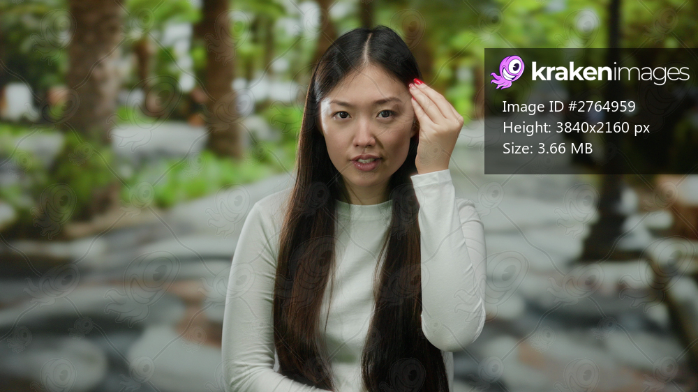 Young beautiful asian woman gesturing on an urban street with trees in the background, showcasing emotion and expression in a casual outdoor setting with soft natural light. - Kraken Images