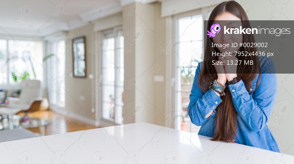 Young beautiful asian woman with long hair wearing denim jacket laughing nervous and excited with hands on chin looking to the side