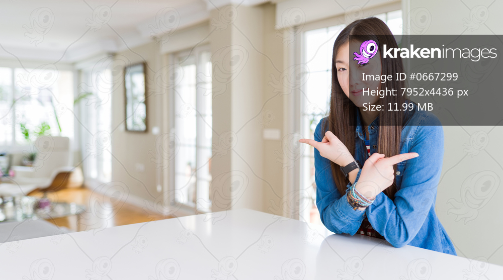 Young beautiful asian woman with long hair wearing denim jacket Pointing to both sides with fingers, different direction disagree