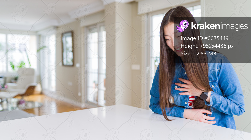 Young beautiful asian woman with long hair wearing denim jacket smiling and laughing hard out loud because funny crazy joke with hands on body.