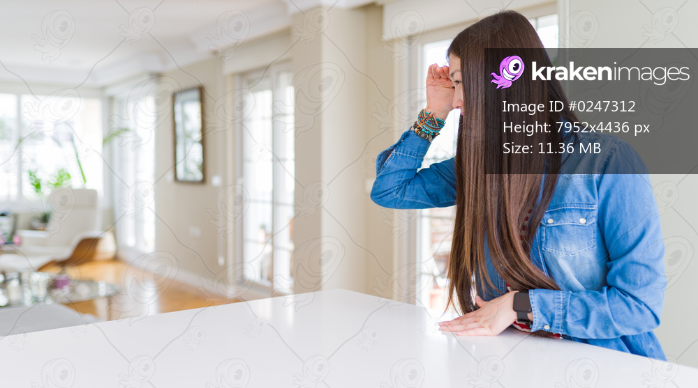 Young beautiful asian woman with long hair wearing denim jacket very happy and smiling looking far away with hand over head. Searching concept.