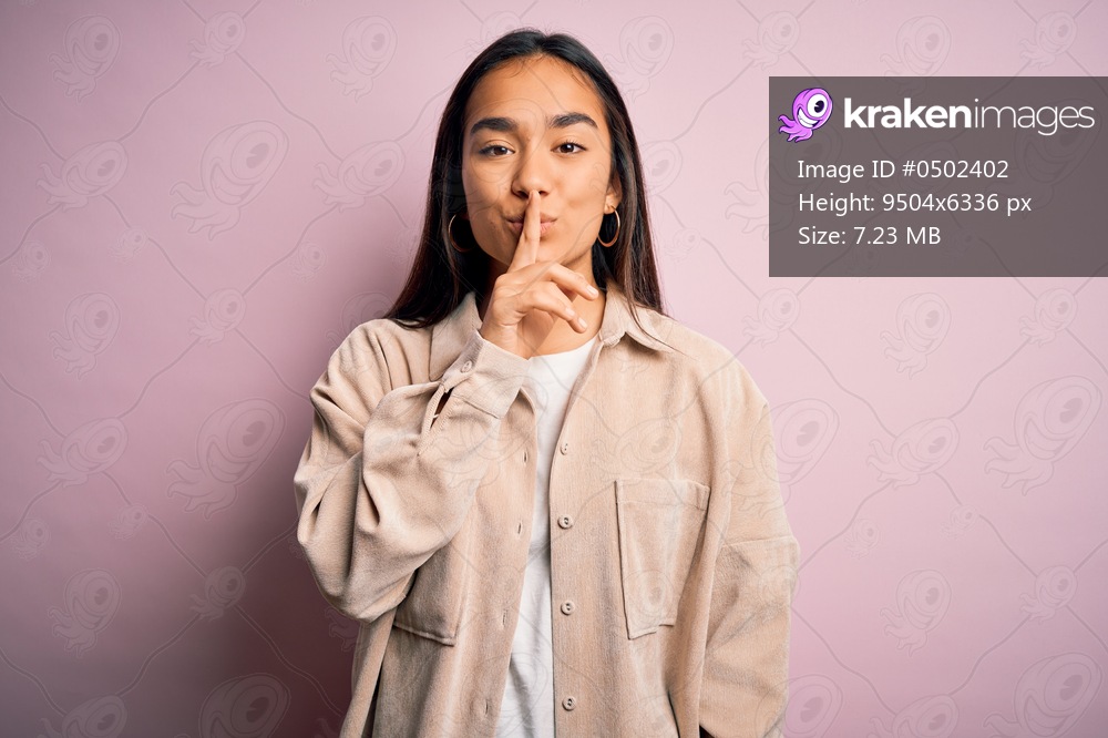 Young beautiful asian woman wearing casual shirt standing over pink background asking to be quiet with finger on lips. Silence and secret concept.