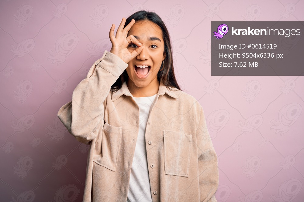 Young beautiful asian woman wearing casual shirt standing over pink background doing ok gesture with hand smiling, eye looking through fingers with happy face. - Kraken Images