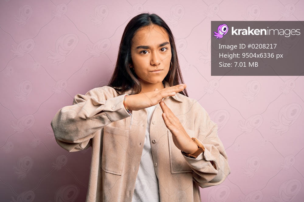 Young beautiful asian woman wearing casual shirt standing over pink background Doing time out gesture with hands, frustrated and serious face