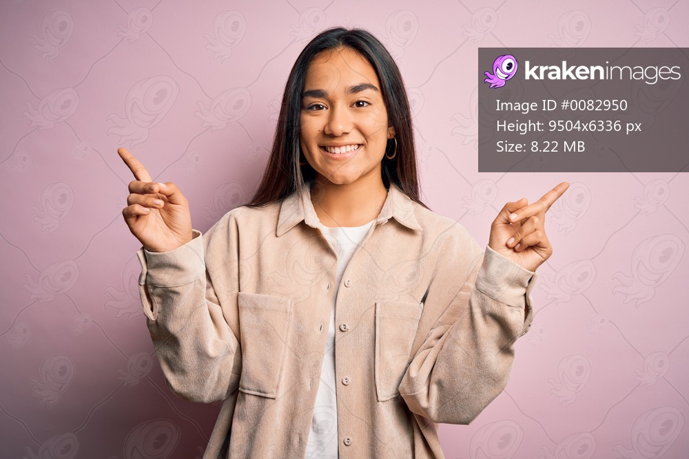 Young beautiful asian woman wearing casual shirt standing over pink background smiling confident pointing with fingers to different directions. Copy space for advertisement - Kraken Images