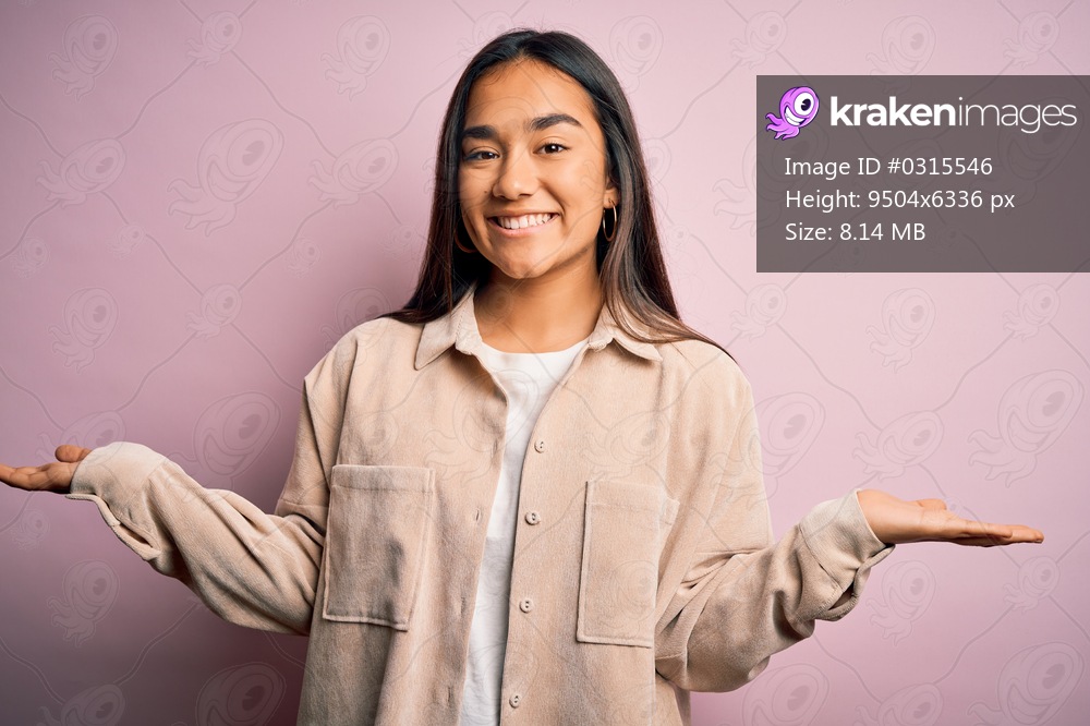Young beautiful asian woman wearing casual shirt standing over pink background smiling showing both hands open palms, presenting and advertising comparison and balance - Kraken Images