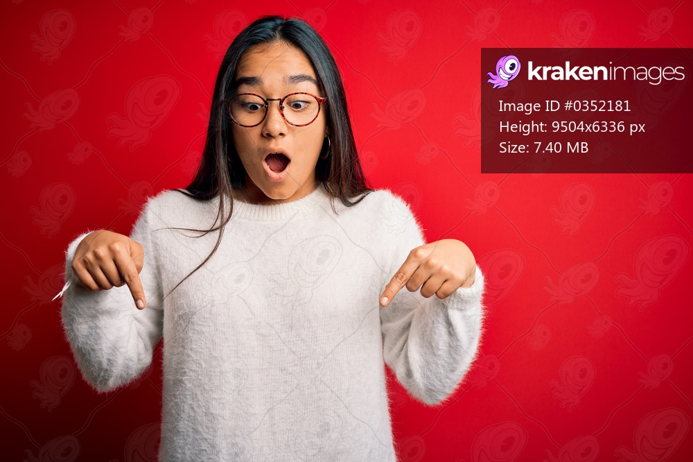 Young beautiful asian woman wearing casual sweater and glasses over red background Pointing down with fingers showing advertisement, surprised face and open mouth - Kraken Images