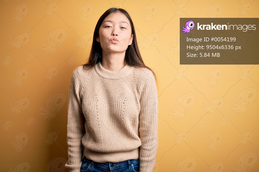 Young beautiful asian woman wearing casual sweater over yellow isolated background looking at the camera blowing a kiss on air being lovely and sexy. Love expression. - Kraken Images
