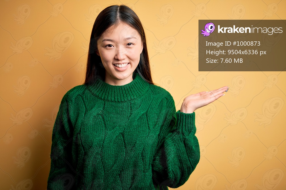 Young beautiful asian woman wearing green winter sweater over yellow isolated background smiling cheerful presenting and pointing with palm of hand looking at the camera. - Kraken Images