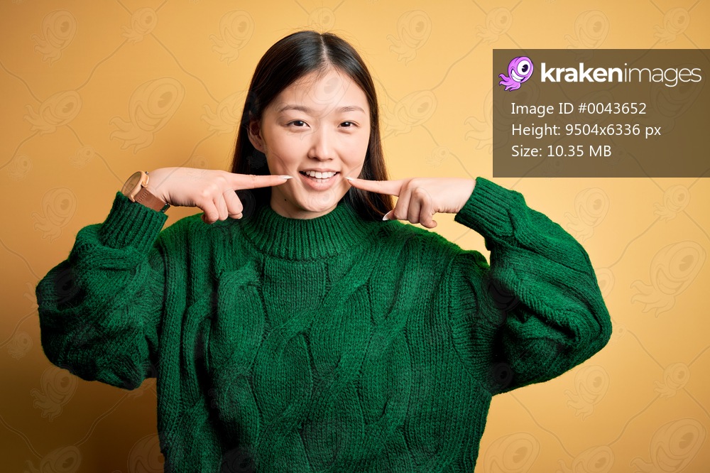 Young beautiful asian woman wearing green winter sweater over yellow isolated background smiling cheerful showing and pointing with fingers teeth and mouth. Dental health concept. - Kraken Images
