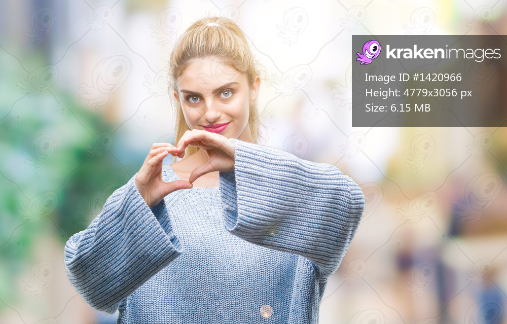 Young beautiful blonde and blue eyes woman wearing winter sweater over isolated background smiling in love showing heart symbol and shape with hands. Romantic concept. - Kraken Images