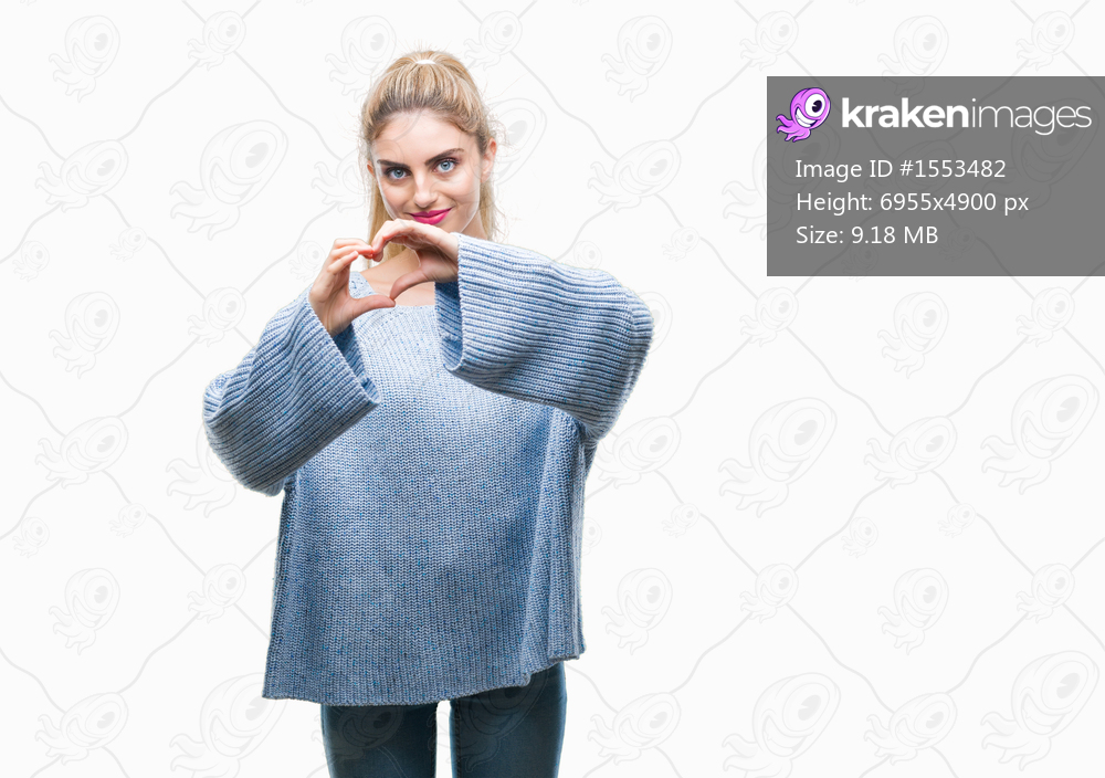 Young beautiful blonde and blue eyes woman wearing winter sweater over isolated background smiling in love showing heart symbol and shape with hands. Romantic concept. - Kraken Images