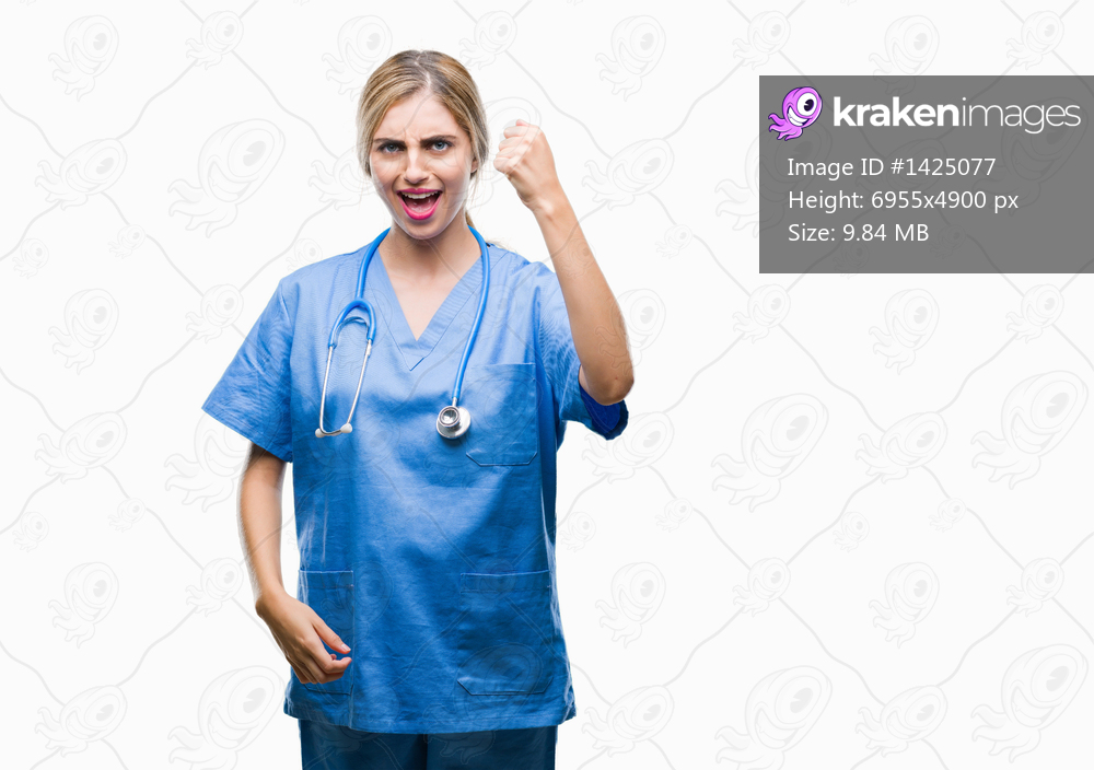 Young beautiful blonde doctor surgeon nurse woman over isolated background angry and mad raising fist frustrated and furious while shouting with anger. Rage and aggressive concept. - Kraken Images