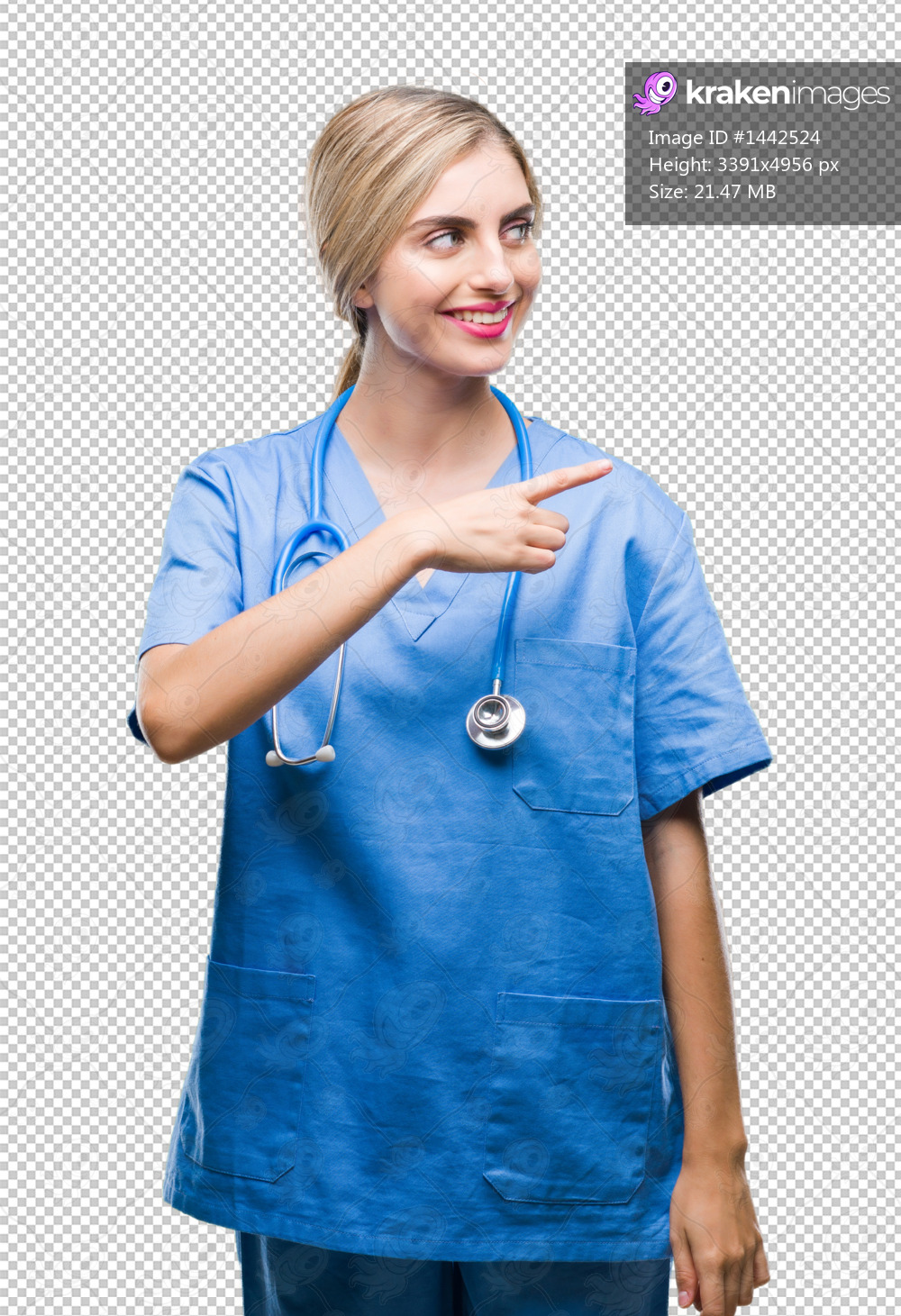 Young beautiful blonde doctor surgeon nurse woman over isolated background cheerful with a smile of face pointing with hand and finger up to the side with happy and natural expression on face looking at the camera. - Kraken Images