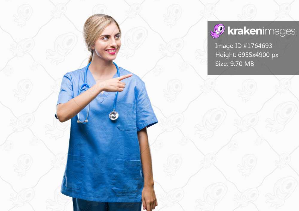 Young beautiful blonde doctor surgeon nurse woman over isolated background cheerful with a smile of face pointing with hand and finger up to the side with happy and natural expression on face looking at the camera. - Kraken Images