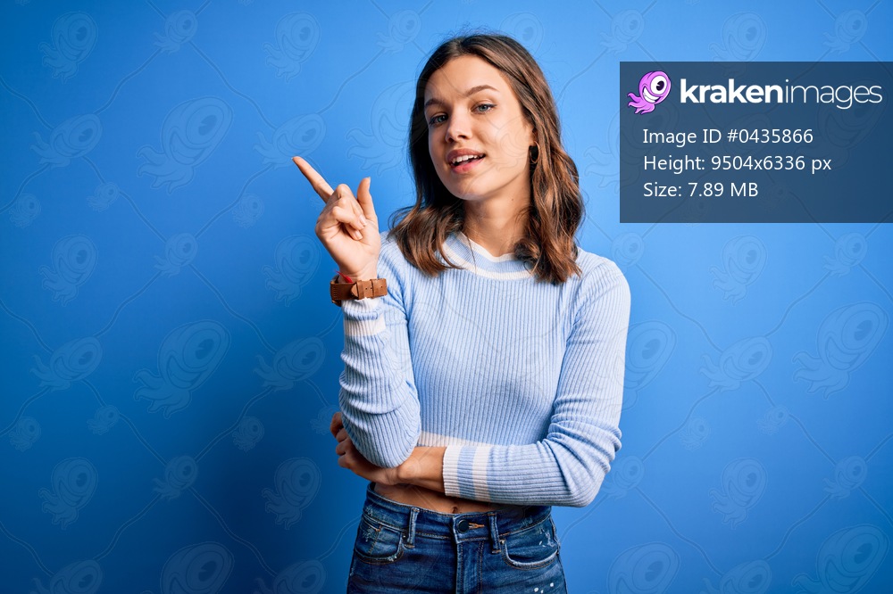 Young beautiful blonde girl wearing casual sweater standing over blue isolated background with a big smile on face, pointing with hand and finger to the side looking at the camera. - Kraken Images