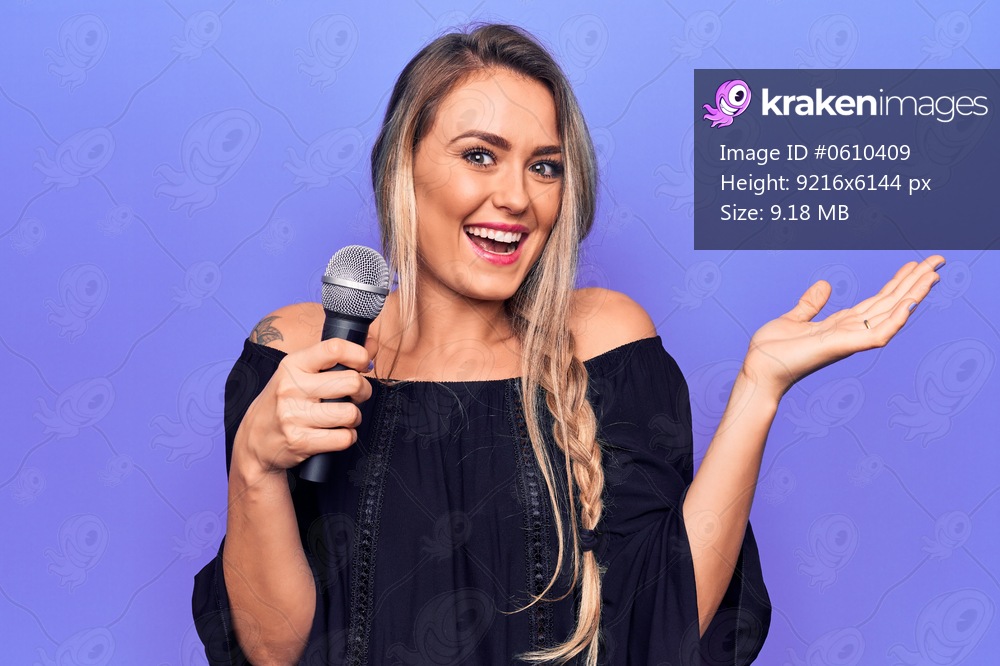 Young beautiful blonde singer woman singing using microphone over purple background celebrating achievement with happy smile and winner expression with raised hand - Kraken Images