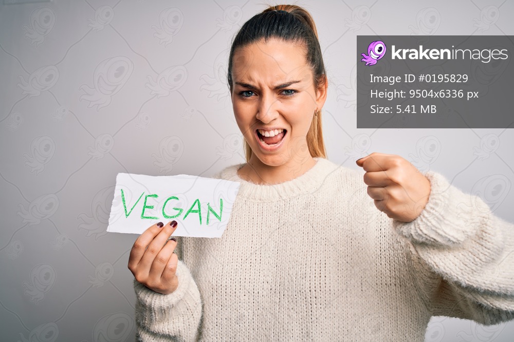 Young beautiful blonde woman with blue eyes holding paper with vegan message annoyed and frustrated shouting with anger, crazy and yelling with raised hand, anger concept - Kraken Images