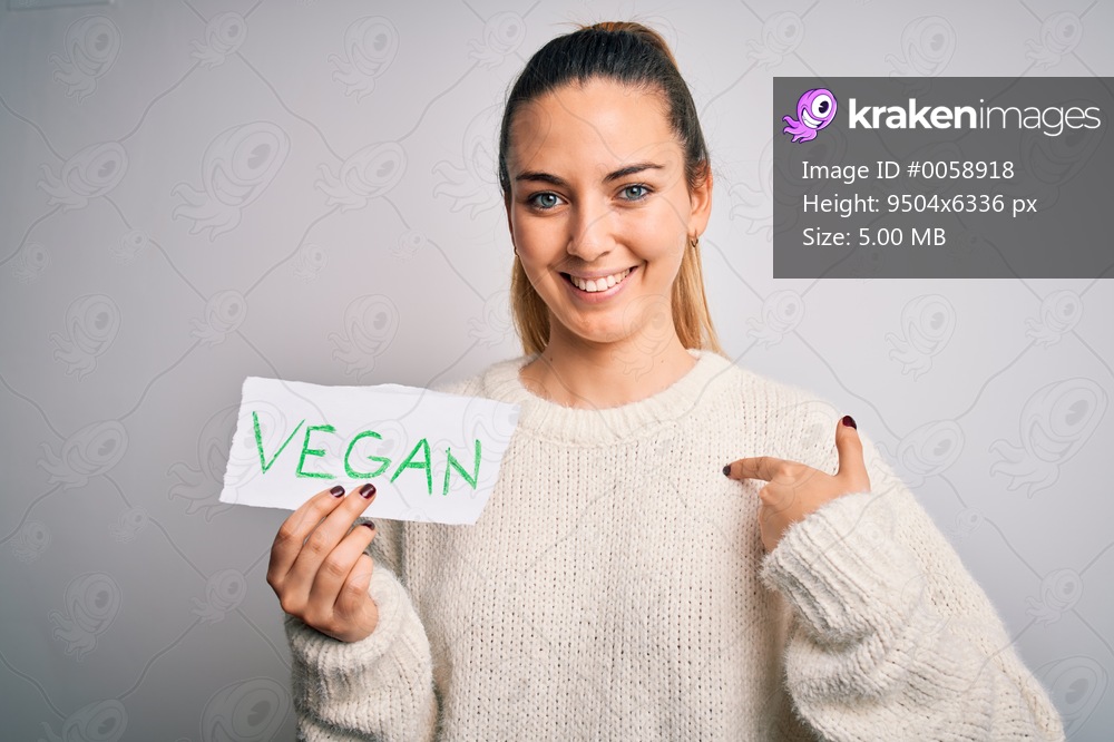 Young beautiful blonde woman with blue eyes holding paper with vegan message with surprise face pointing finger to himself