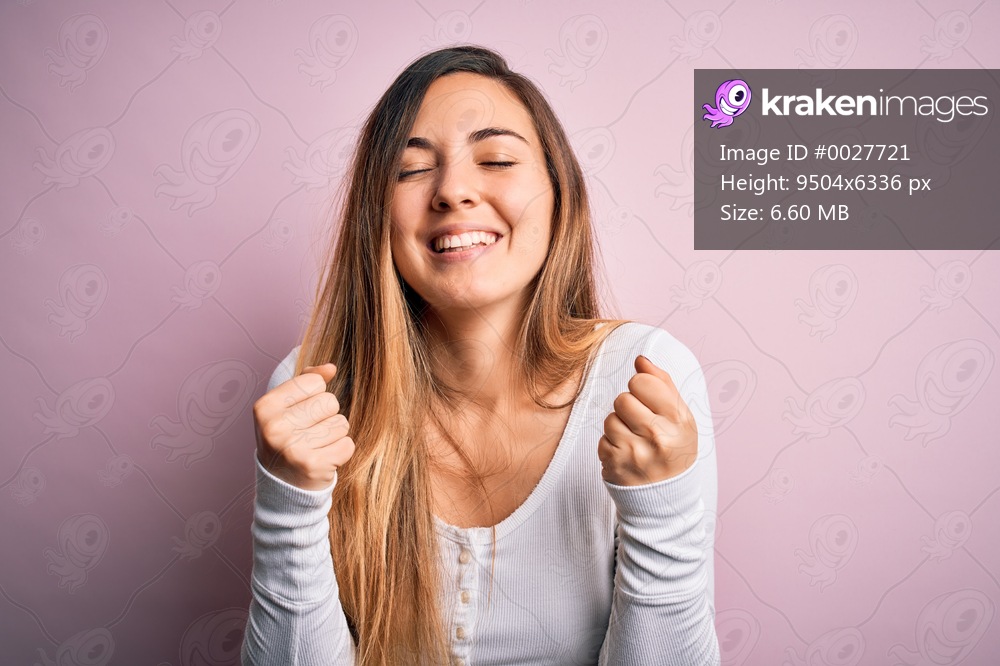 Young beautiful blonde woman with blue eyes wearing white t-shirt over pink background excited for success with arms raised and eyes closed celebrating victory smiling. Winner concept. - Kraken Images