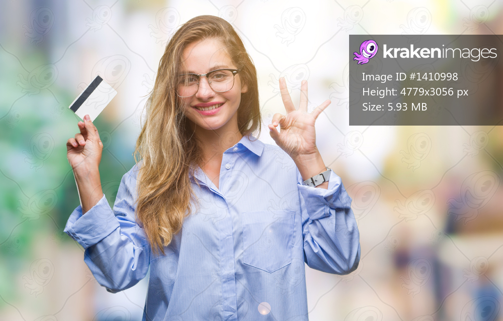 Young beautiful blonde woman holding credit card over isolated background doing ok sign with fingers, excellent symbol