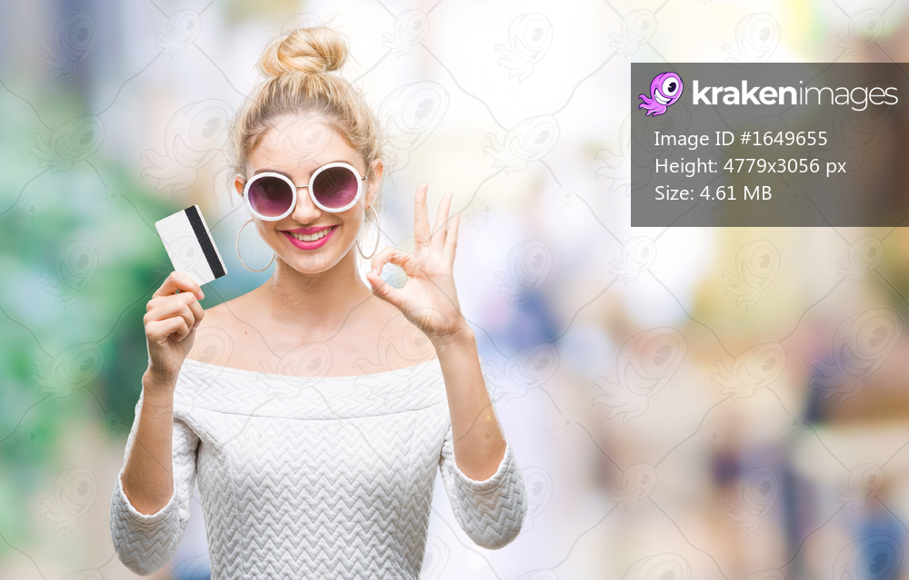 Young beautiful blonde woman holding credit card over isolated background doing ok sign with fingers, excellent symbol