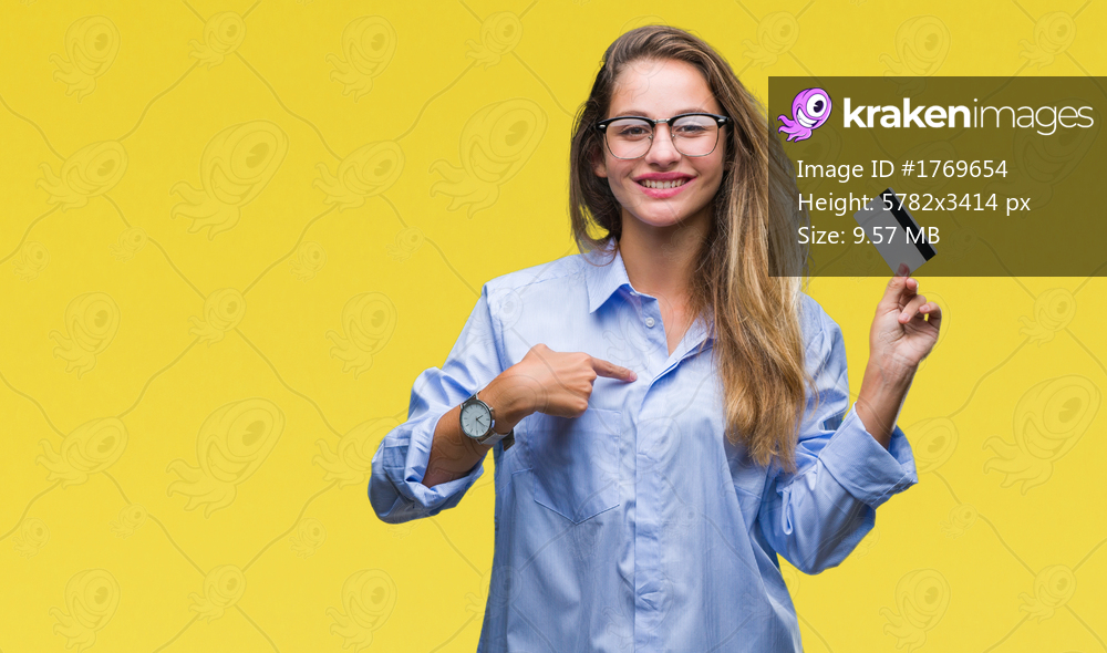 Young beautiful blonde woman holding credit card over isolated background with surprise face pointing finger to himself