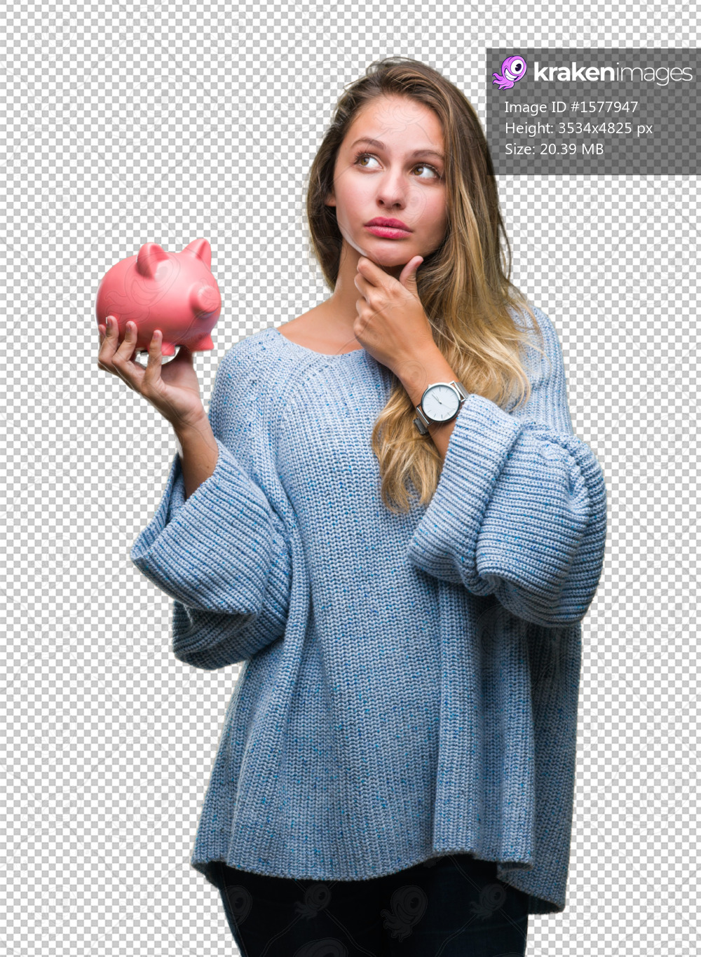 Young beautiful blonde woman holding piggy bank over isolated background serious face thinking about question, very confused idea