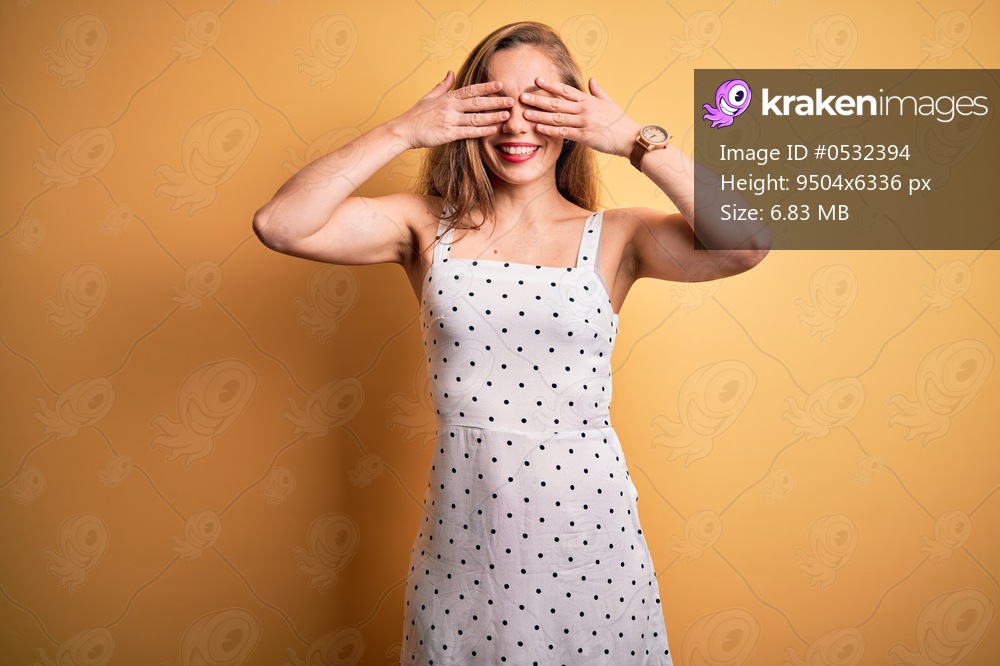 Young beautiful blonde woman on vacation wearing summer dress over yellow background covering eyes with hands smiling cheerful and funny. Blind concept. - Kraken Images