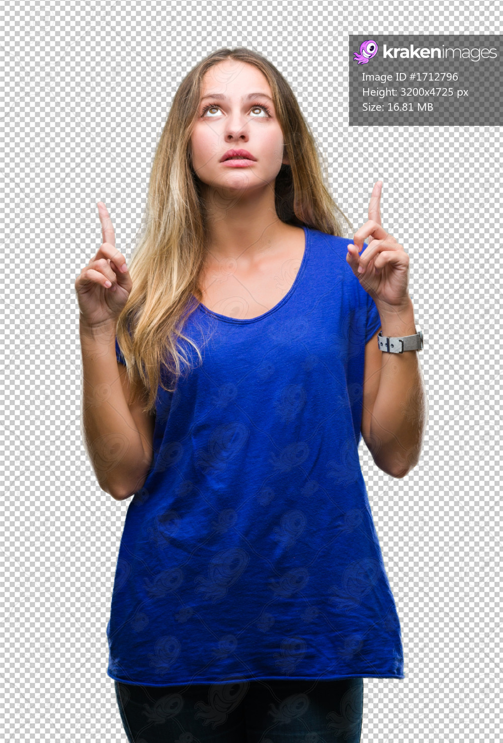 Young beautiful blonde woman over isolated background amazed and surprised looking up and pointing with fingers and raised arms.