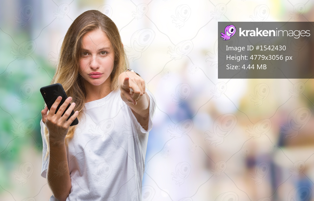 Young beautiful blonde woman using smartphone over isolated background pointing with finger to the camera and to you, hand sign, positive and confident gesture from the front - Kraken Images