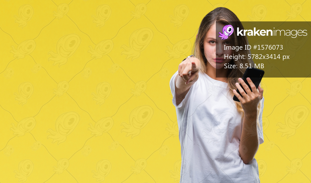 Young beautiful blonde woman using smartphone over isolated background pointing with finger to the camera and to you, hand sign, positive and confident gesture from the front - Kraken Images