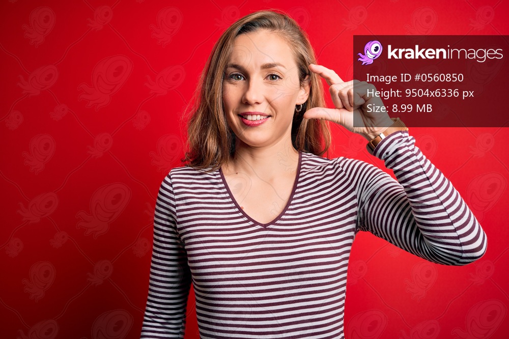 Young beautiful blonde woman wearing casual striped t-shirt over isolated red background smiling and confident gesturing with hand doing small size sign with fingers looking and the camera. Measure concept. - Kraken Images