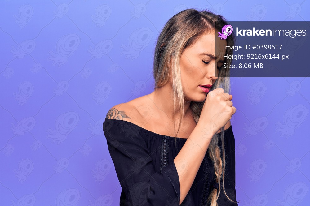 Young beautiful blonde woman wearing casual t-shirt standing over isolated purple background feeling unwell and coughing as symptom for cold or bronchitis. Health care concept. - Kraken Images