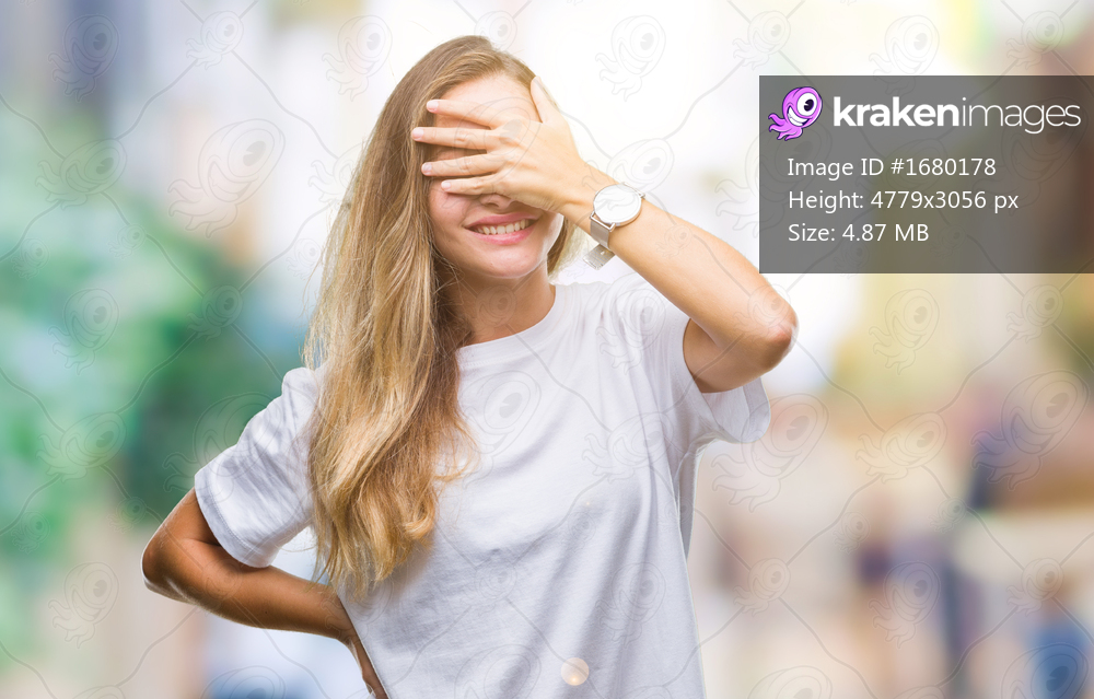 Young beautiful blonde woman wearing casual white t-shirt over isolated background smiling and laughing with hand on face covering eyes for surprise. Blind concept. - Kraken Images