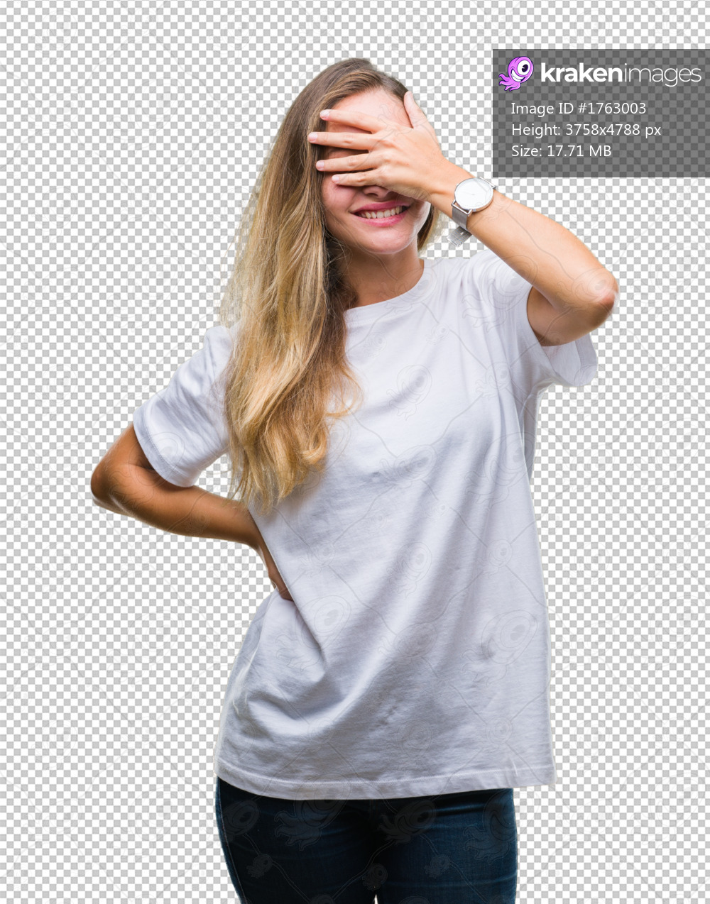 Young beautiful blonde woman wearing casual white t-shirt over isolated background smiling and laughing with hand on face covering eyes for surprise. Blind concept. - Kraken Images