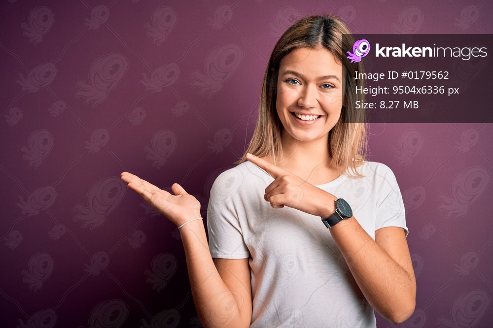 Young beautiful blonde woman wearing casual white t-shirt over purple isolated background amazed and smiling to the camera while presenting with hand and pointing with finger. - Kraken Images