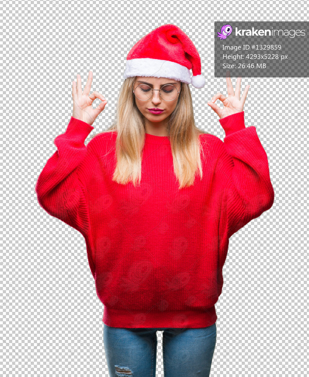 Young beautiful blonde woman wearing christmas hat over isolated background relax and smiling with eyes closed doing meditation gesture with fingers. Yoga concept. - Kraken Images