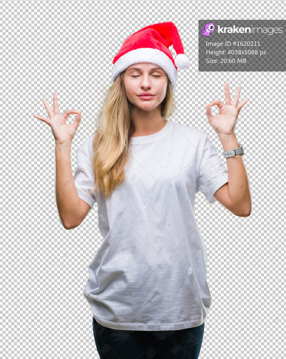 Young beautiful blonde woman wearing christmas hat over isolated background relax and smiling with eyes closed doing meditation gesture with fingers. Yoga concept. - Kraken Images