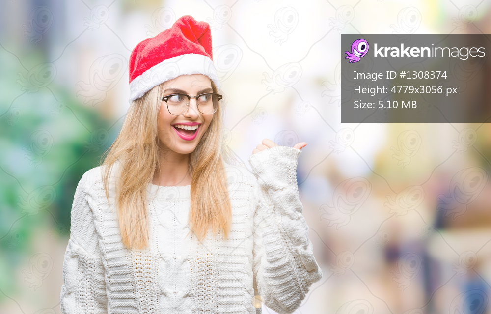 Young beautiful blonde woman wearing christmas hat over isolated background smiling with happy face looking and pointing to the side with thumb up.
