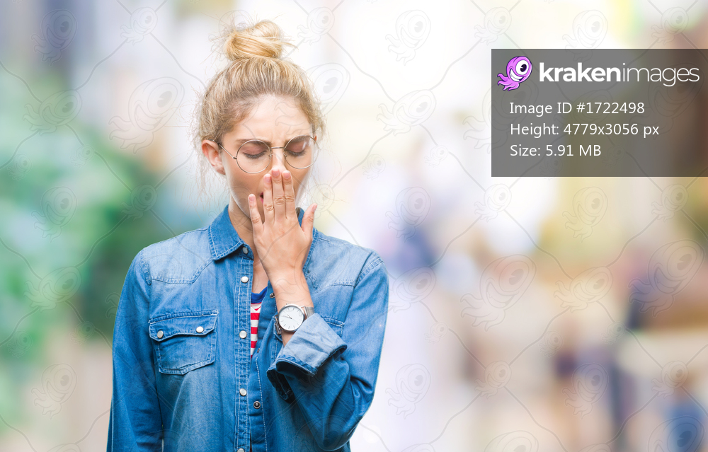 Young beautiful blonde woman wearing glasses over isolated background bored yawning tired covering mouth with hand. Restless and sleepiness.