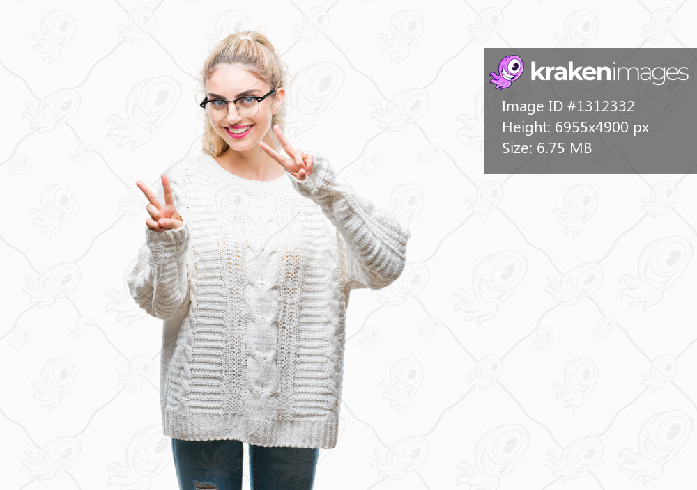 Young beautiful blonde woman wearing glasses over isolated background smiling looking to the camera showing fingers doing victory sign. Number two.