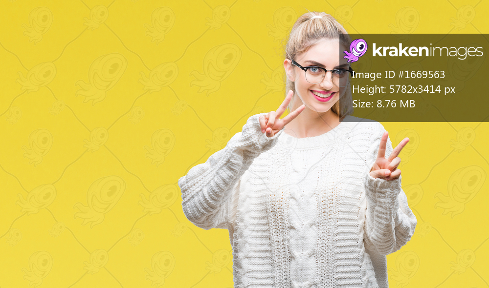 Young beautiful blonde woman wearing glasses over isolated background smiling looking to the camera showing fingers doing victory sign. Number two.
