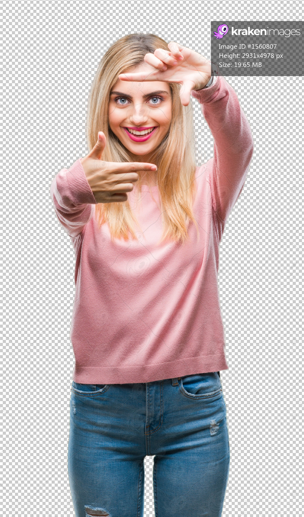 Young beautiful blonde woman wearing pink winter sweater over isolated background smiling making frame with hands and fingers with happy face. Creativity and photography concept. - Kraken Images