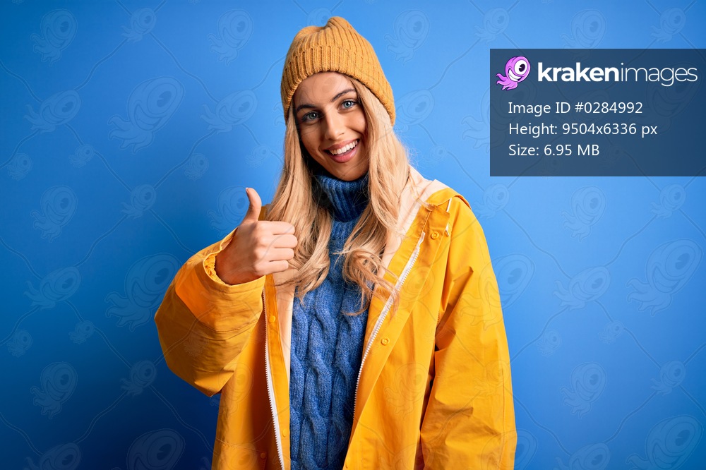 Young beautiful blonde woman wearing raincoat for rainy weather over blue background doing happy thumbs up gesture with hand. Approving expression looking at the camera showing success. - Kraken Images