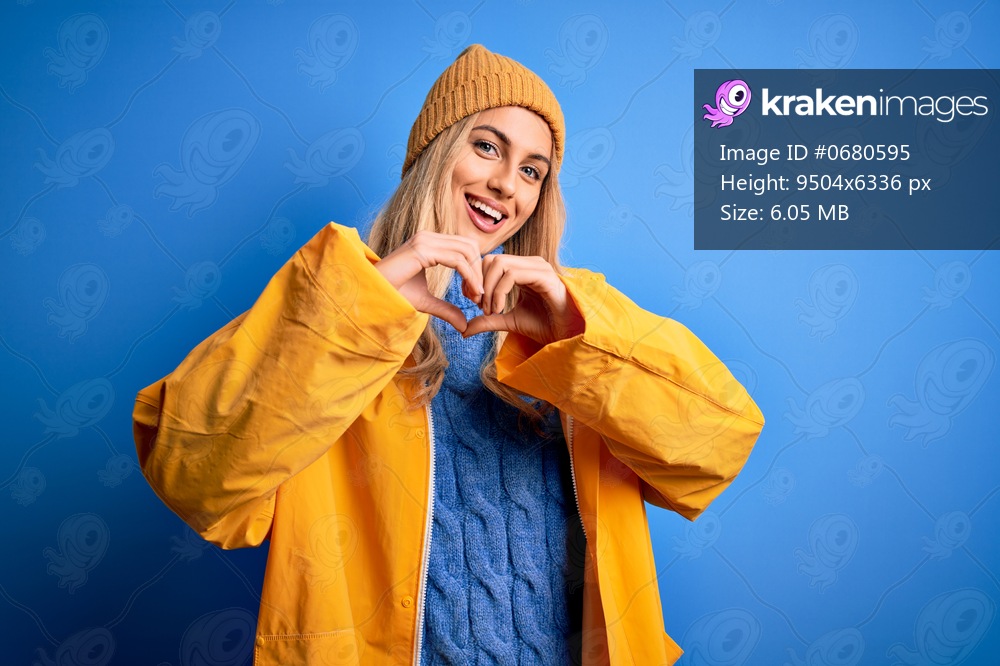 Young beautiful blonde woman wearing raincoat for rainy weather over blue background smiling in love showing heart symbol and shape with hands. Romantic concept. - Kraken Images